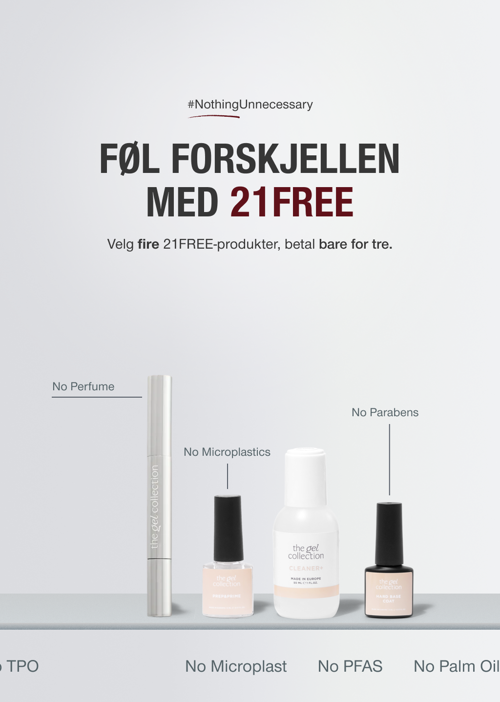 Alle produkter fra The Gel Collection er basert på vårt 21free-konsept som ikke inneholder 21 typer potensielt skadelige ingredienser. Samtidig er de veganske, produsert i EU og tilsatt mineraler for å sikre maksimal styrke og holdbarhet.