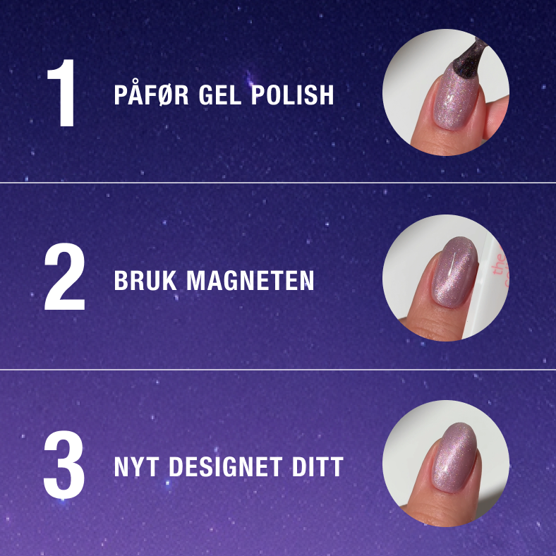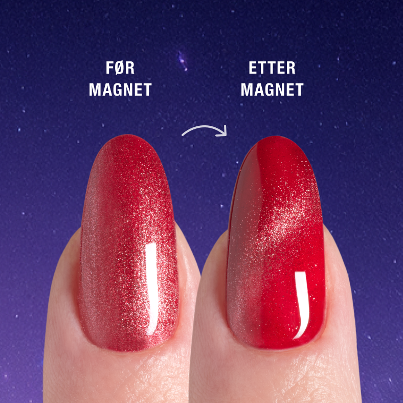 - Påfør et andre lag Cat Eye Gel Polish og bruk den medfølgende Cat Eye Magnet for å skape ønsket mønster. Når du er fornøyd med mønsteret, herder du raskt i UV/LED-lampen for å feste designet.