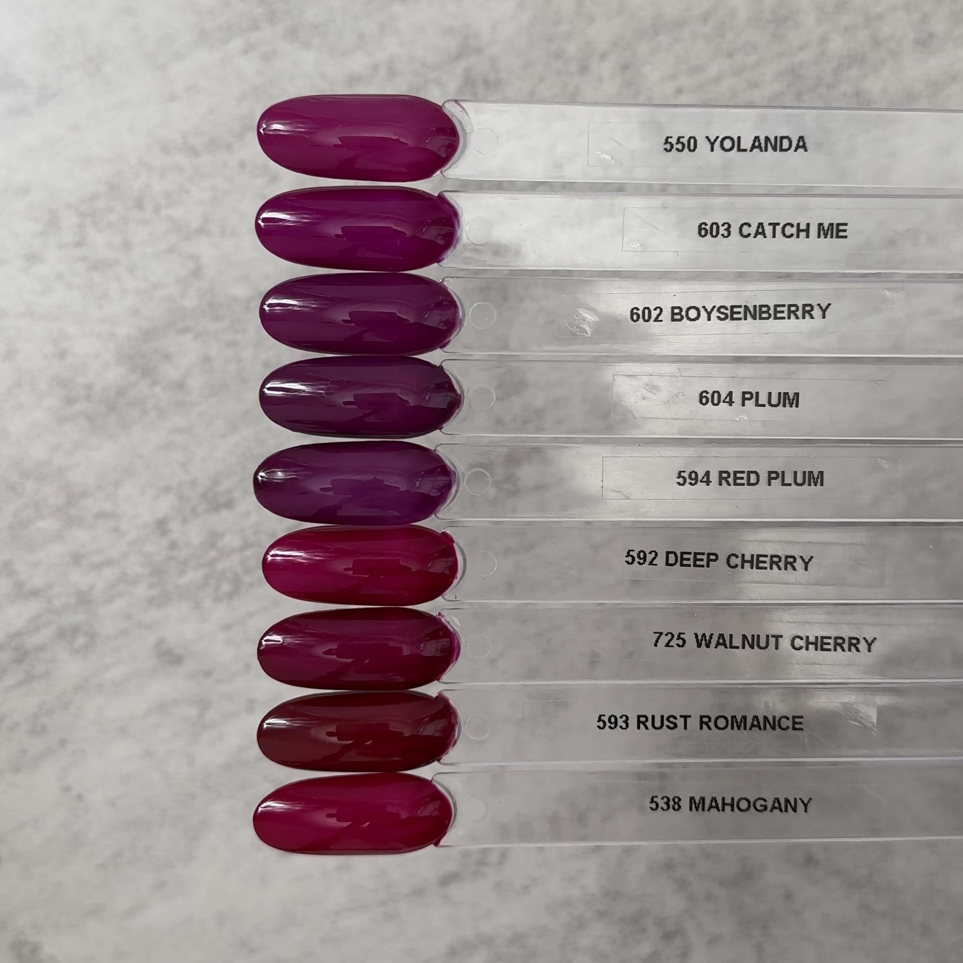 594 Red Plum fra The Gel Collection har en dyp mørklilla farge som en frisk og deilig mørk plomme. Den er svært transparent ved 2 lag, men kan bli fullt dekkende ved 3-4 lag. Den kan brukes for seg selv eller påføres som en vakker effekt over en annen Gel Polish farge.