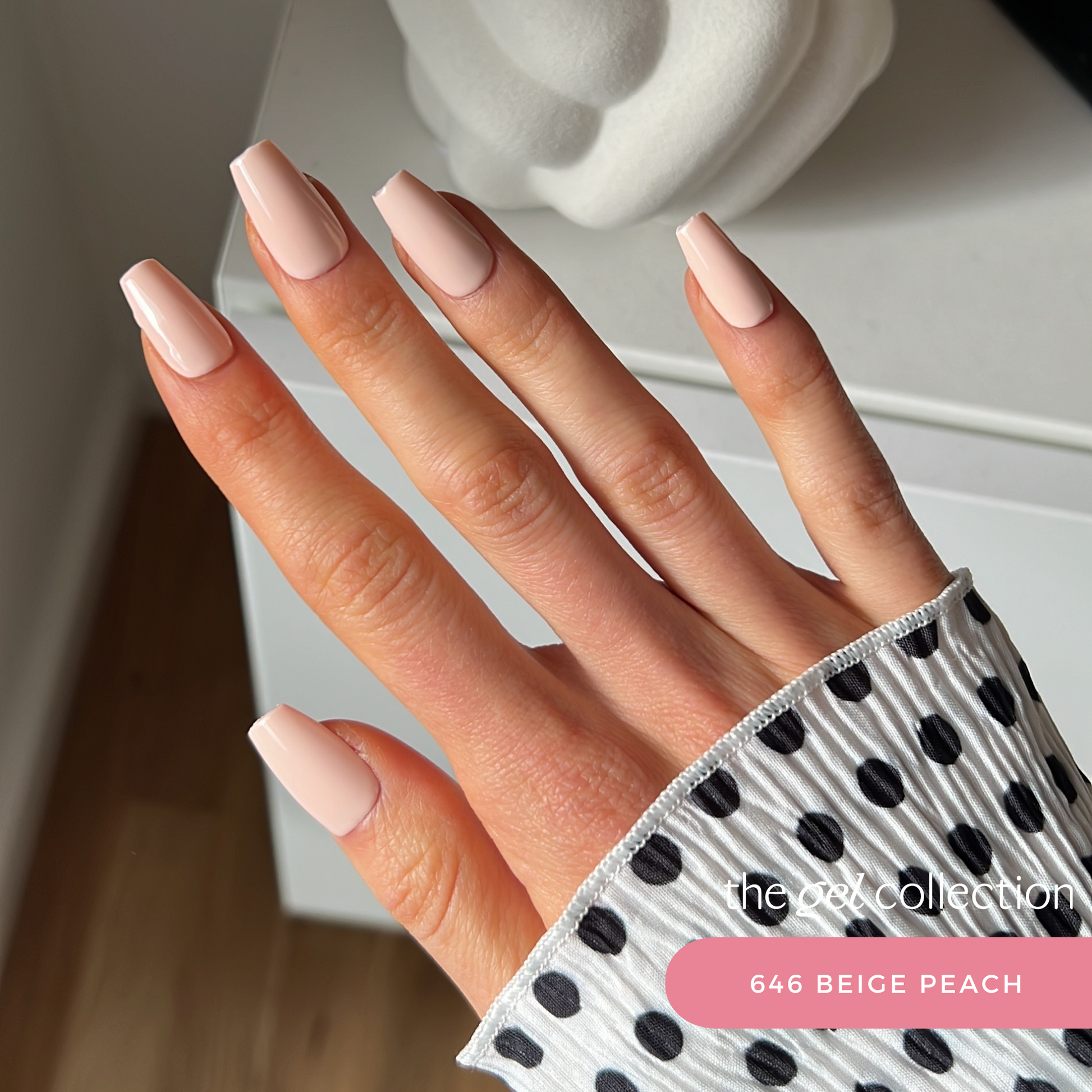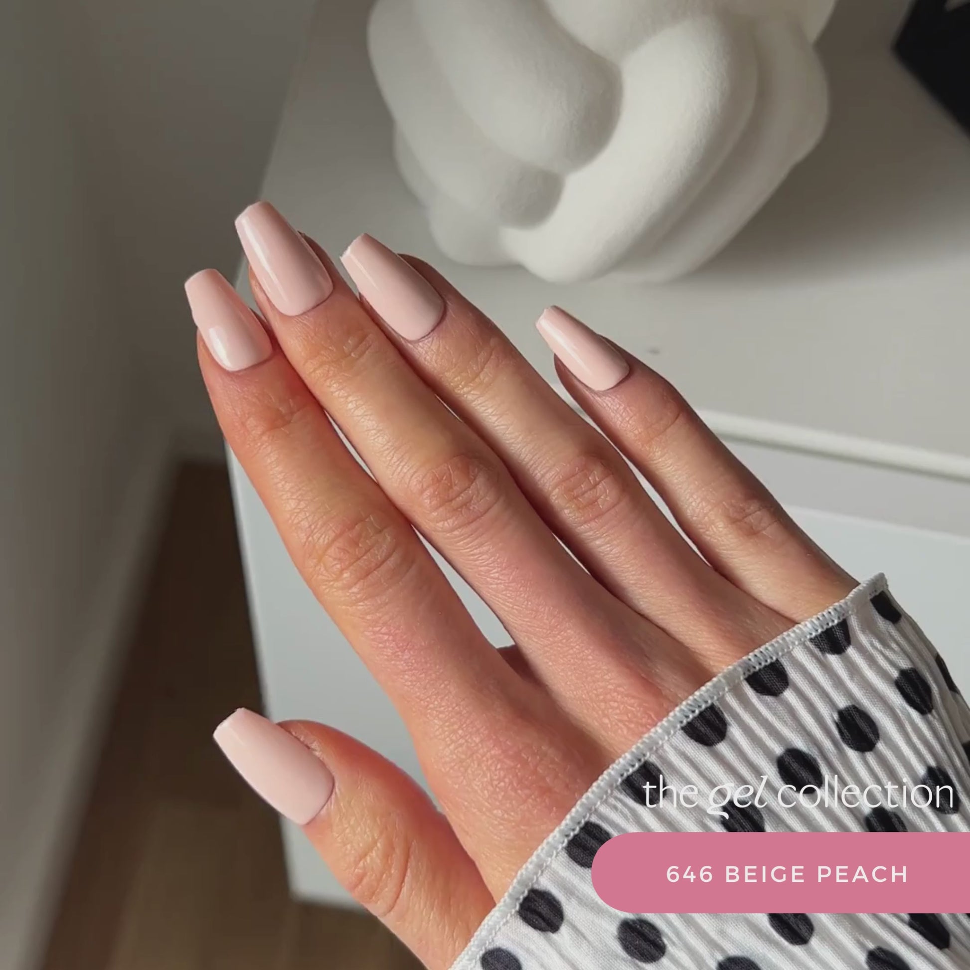 646 Beige Peach fra The Gel Collection er en fantastisk nøytral beige farge med en rosa undertone. Fargen er inspirert av naturen og er perfekt for å skape negler med et naturlig og harmonisk utseende.