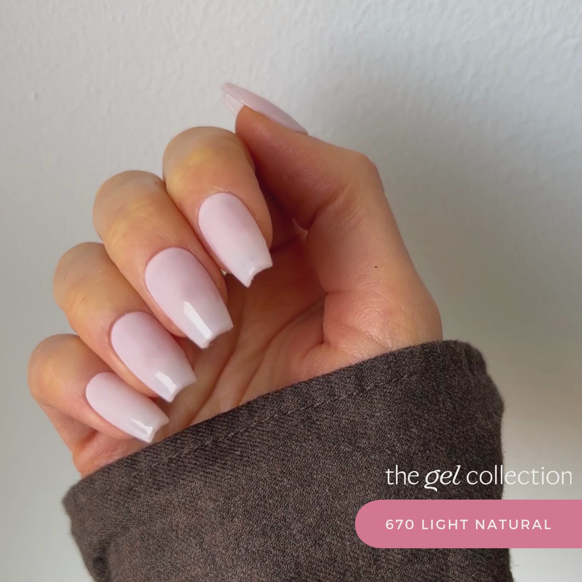 670 Light Natural fra The Gel Collection er en lys og nøytral rosa nyanse. Fargen minner om de vakreste rosefargede blomsterblader, som forsiktig dekker neglene dine med en glød av naturlig skjønnhet. Den er perfekt for å skape et naturlig og sofistikert utseende..