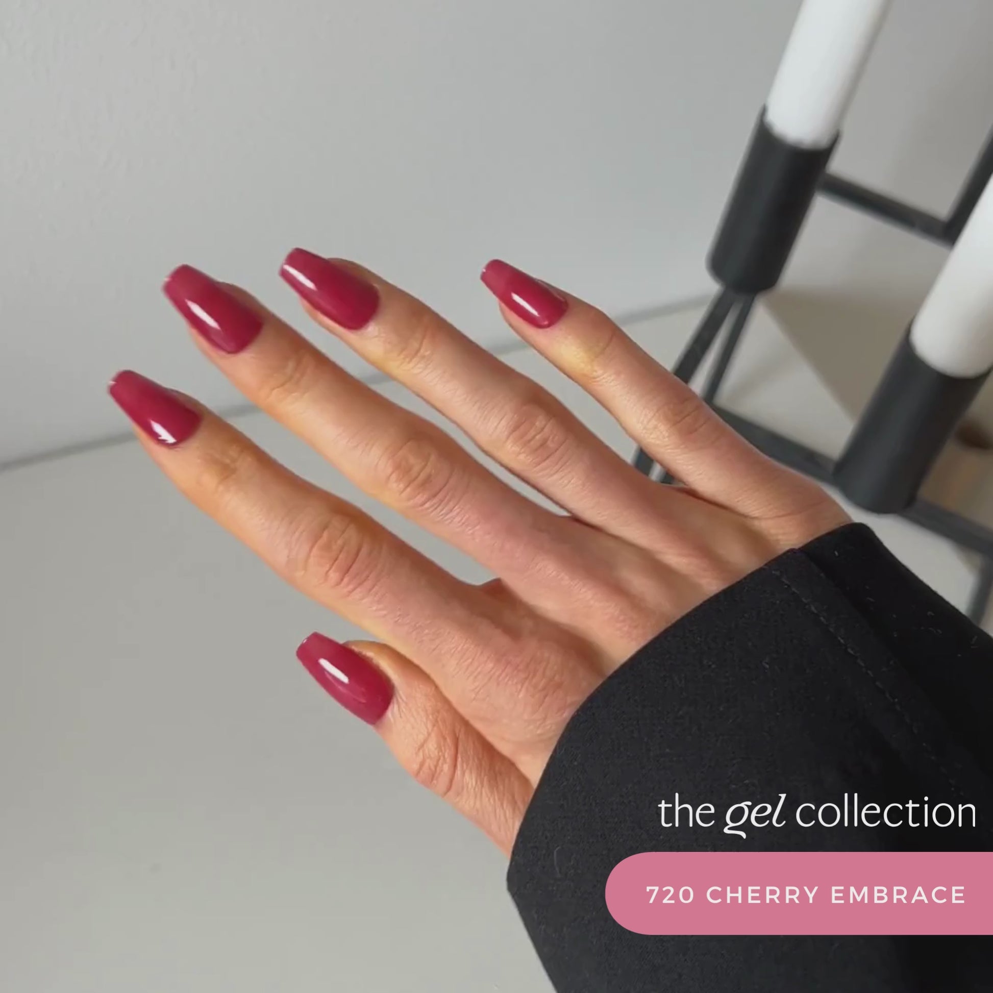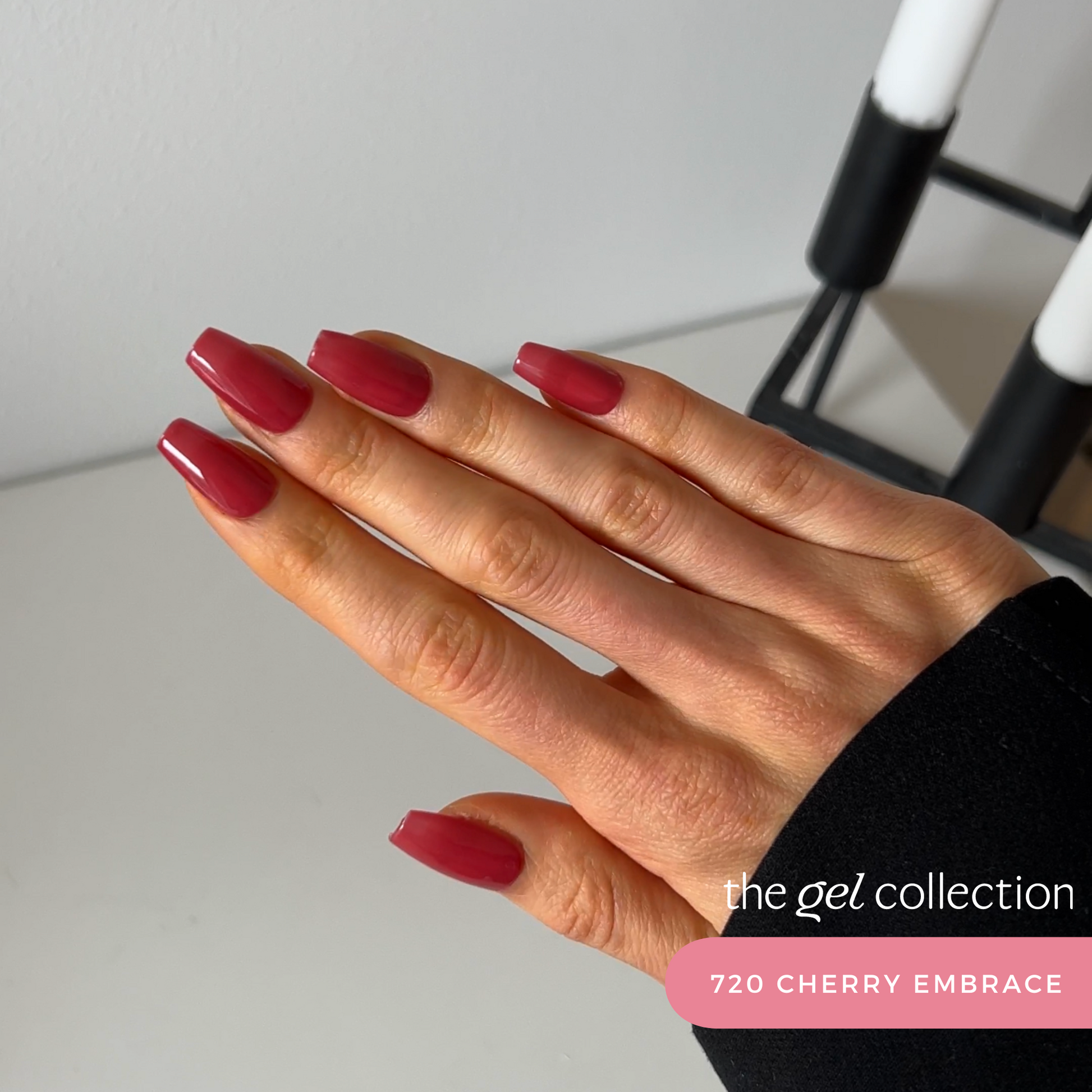 720 Cherry Embrace fra The Gel Collection er en semi-transparent vakker bronserød nyanse. Den minner om smaken av søte sommerkirsebær som gjerne vekker assosiasjoner til varme sommerdager.