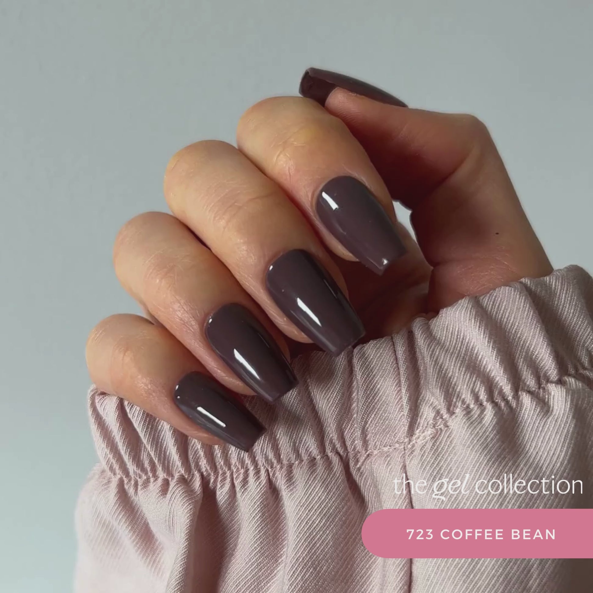 723 Coffee Bean fra The Gel Collection er mørkebrun med en lilla undertone. Dens rike og fyldige nyanse utstråler en nedtonet eleganse som gjør neglene til en subtil hyllest til klassisk skjønnhet.