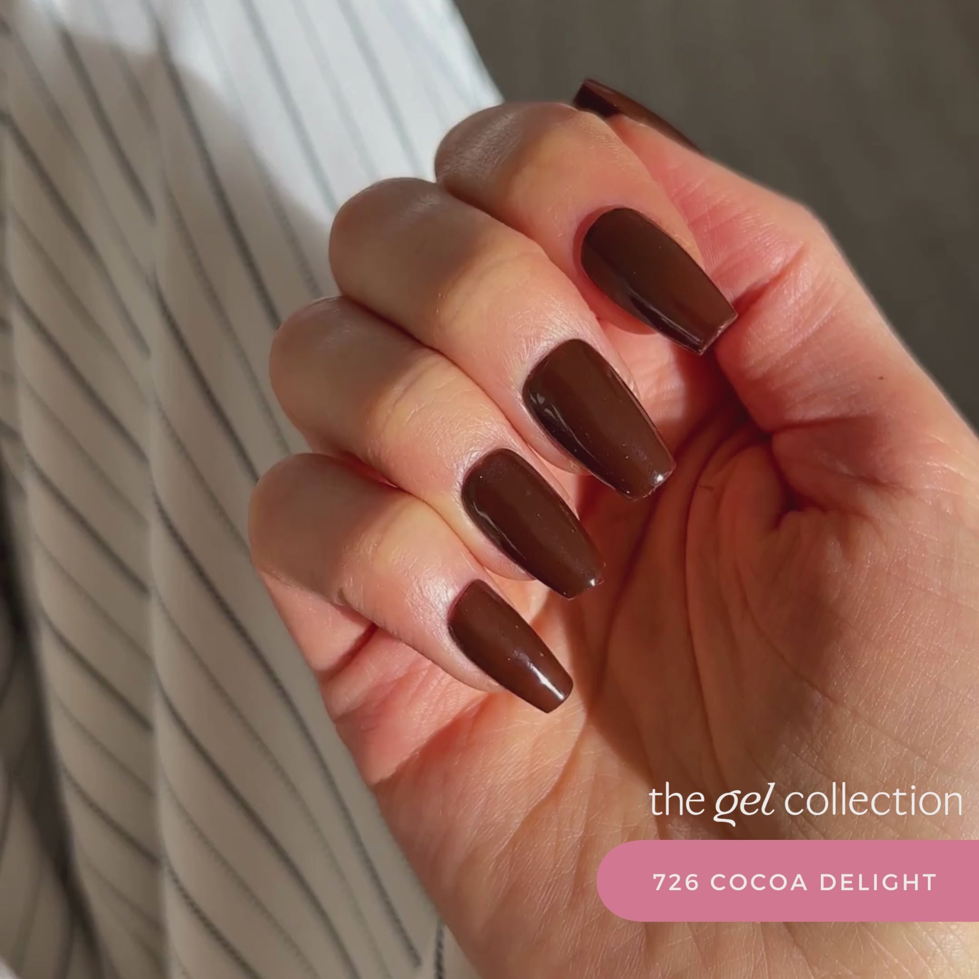 726 Cocoa Delight fra The Gel Collection er mørk kakaobrun. Denne nyansen utstråler en jordnær varme og dybde, som kan være både beroligende og forførende, og vekker assosiasjoner til luksus, komfort og vakre høstlandskaper.