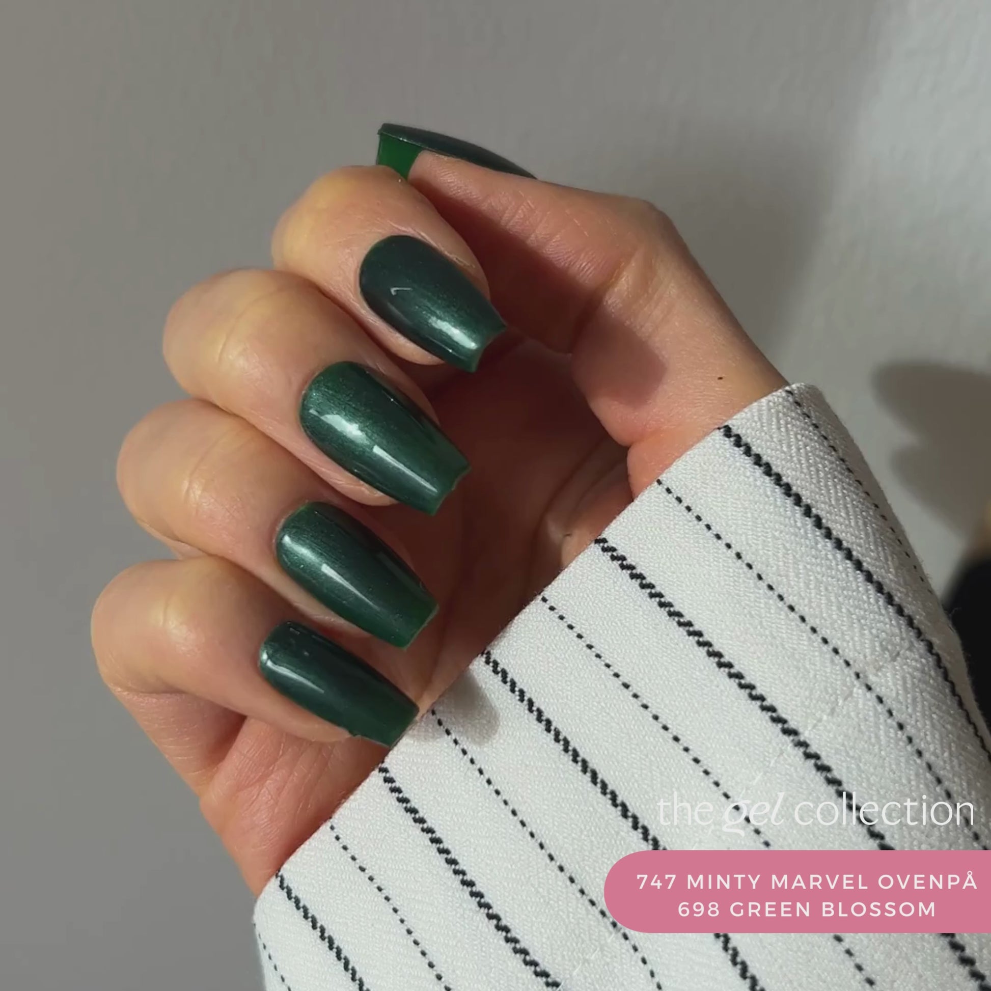747 Minty Marvel fra The Gel Collection er semi-transparent dyp mørkegrønn med helt fint glimmer. Det fine glimmeret legger til en subtil magi til fargen og lar tankene sveve til naturens mystikk og skjønnhet.
