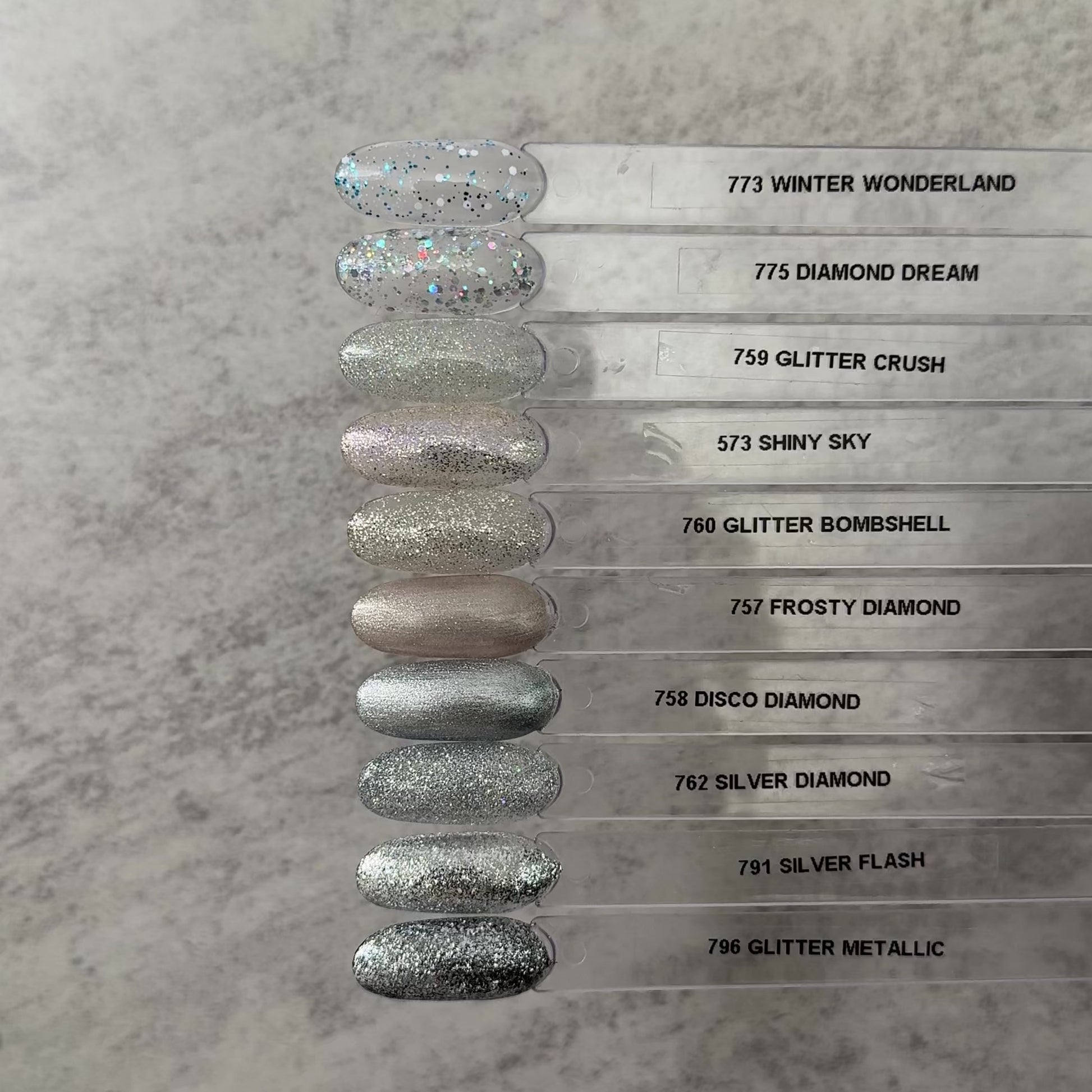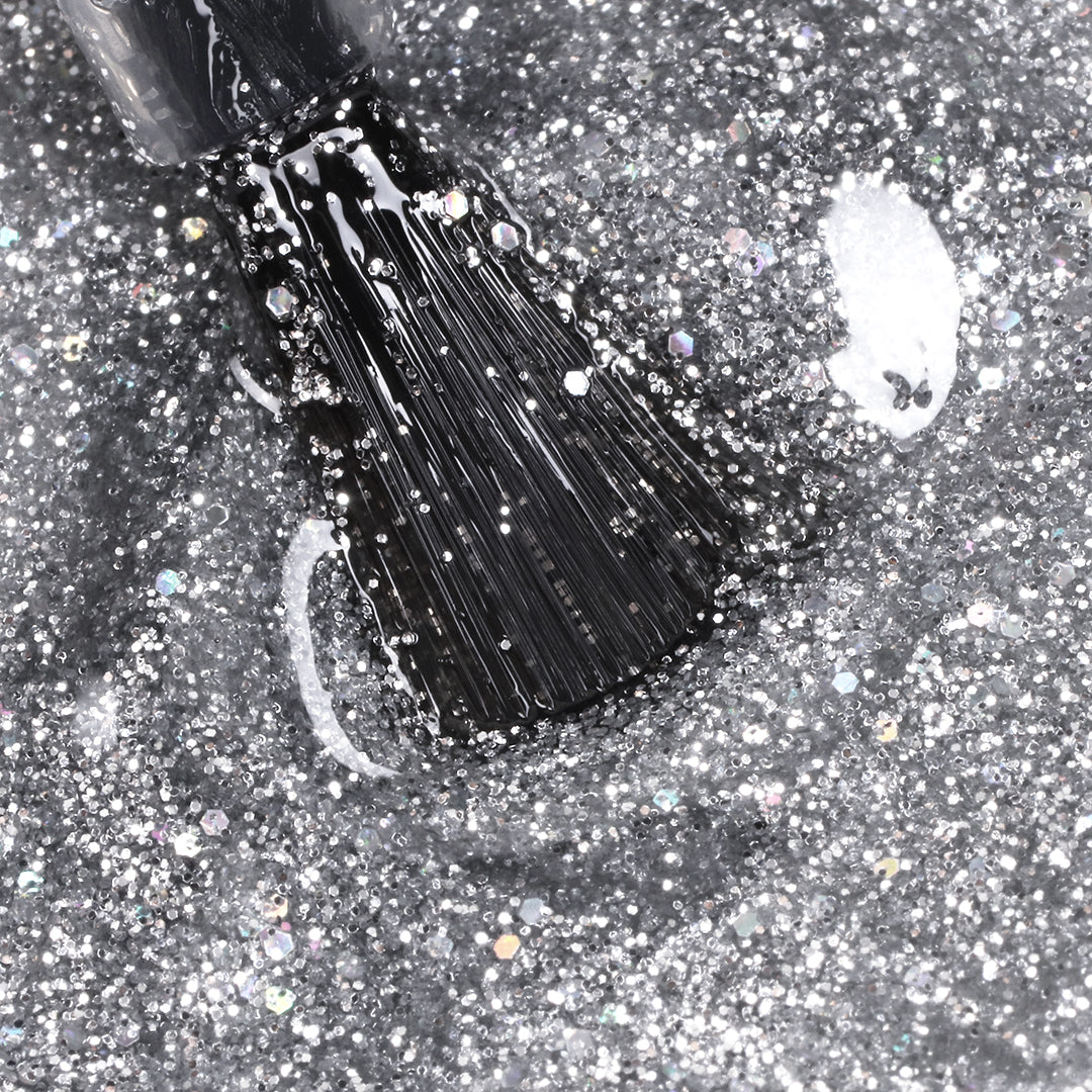 762 Silver Diamond fra The Gel Collection er klar transparent med både store og små tette sølvglimmerbiter som fanger og reflekterer lyset i vakre gnister og glans.