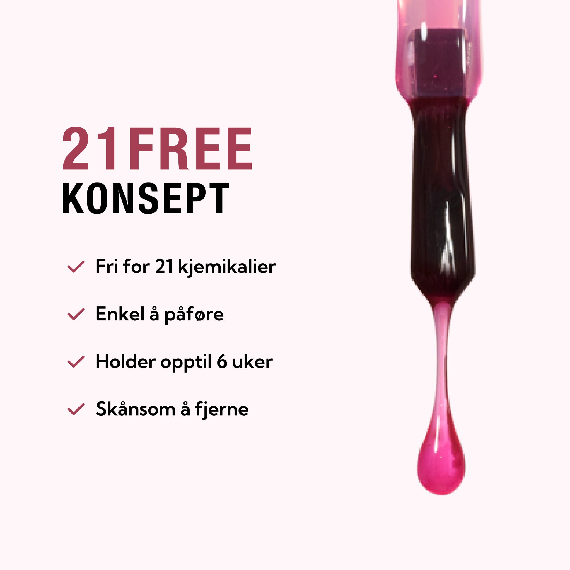Vår gellakk skiller seg ut med færre kjemikalier og skånsomhet for neglene, i motsetning til mange andre merker. Vi bygger på et sterkt fellesskap med læringsvideoer for å støtte deg gjennom hele skjønnhetsreisen din. Vi utvikler og forbedrer 21FREE-produktene våre kontinuerlig for å sikre at du får de mest skånsomme og langvarige produktene.