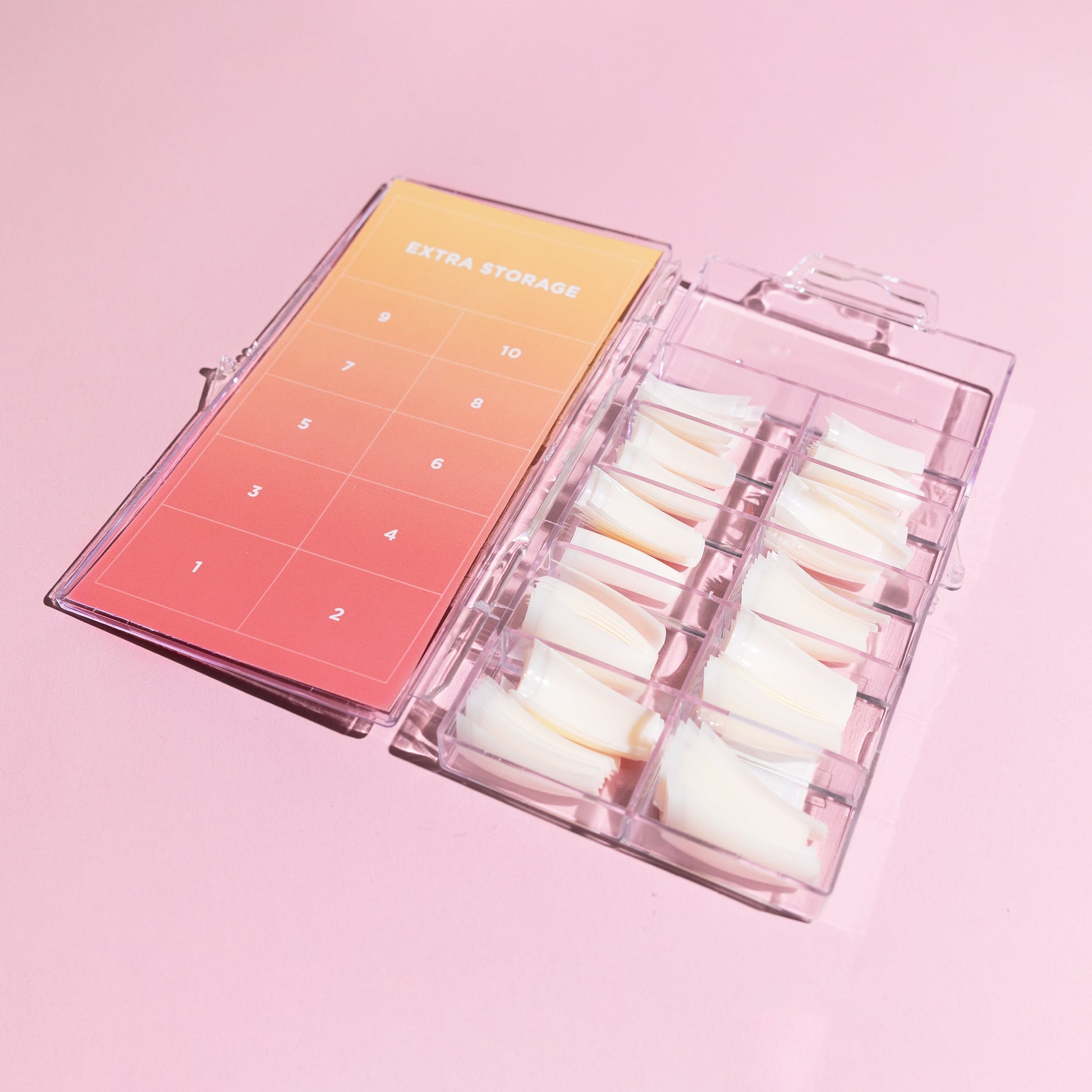 Settet inneholder 10 tipper á 10 forskjellige størrelser - altså 100 tipper totalt. Med dette settet får du dermed alle størrelsene du kan få bruk for når du lager negleforlengelser. I boksen er det plassert nummer for å gi deg en lett og god oversikt over tippens størrelser og plasseringer.